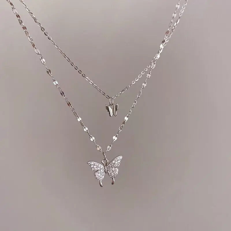 The Double Flutter Necklace layers two 18K gold-plated chains, each adorned with a sparkling butterfly-shaped rhinestone crystal pendant. With a delicate, smaller butterfly on one chain and a striking, larger butterfly on the other, this piece adds an elegant touch to any look.